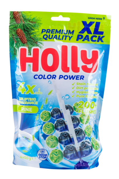 Holly Color Power Pine – WC tablete z vonjem bora, ki odstranjujejo madeže, preprečujejo vodni kamen, zagotavljajo higiensko peno in dolgotrajno svežino. Vsebina: 4×50 g, za več kot 200 splakovanj.