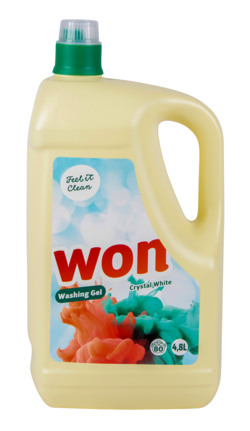 Won Crystal White – pralni gel za belo perilo, ki obnavlja belino, odstranjuje madeže in preprečuje sivljenje tkanin. Nežen do vlaken in primeren za vsakodnevno pranje. Vsebina: 4,8 L, do 80 pranj.